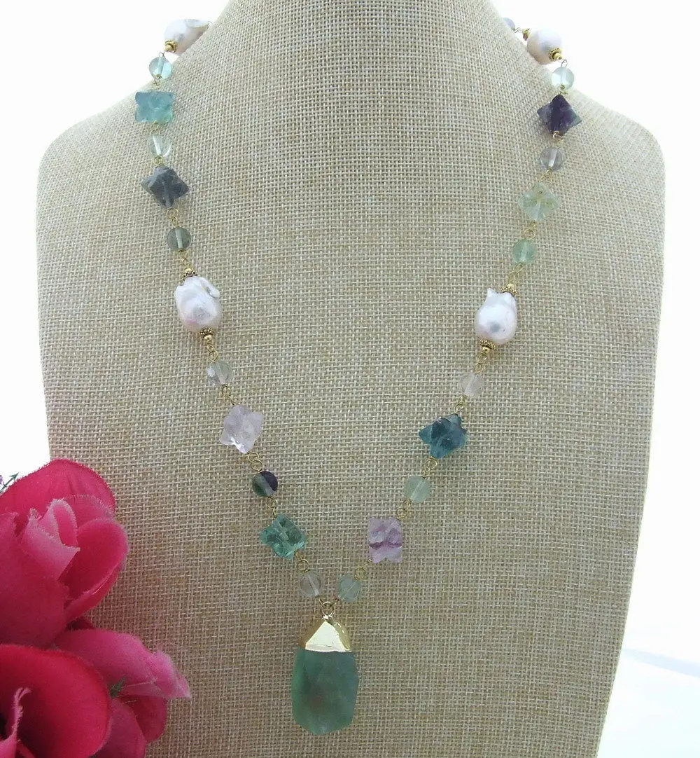 REVIEW TOP SELLER FC041706 24" Natural White Keshi Pearl Necklace Green Fluorie Pendant