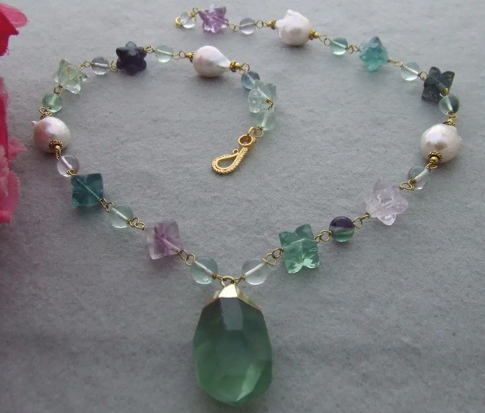 FC041706 24" Natural White Keshi Pearl Necklace Green Fluorie Pendant